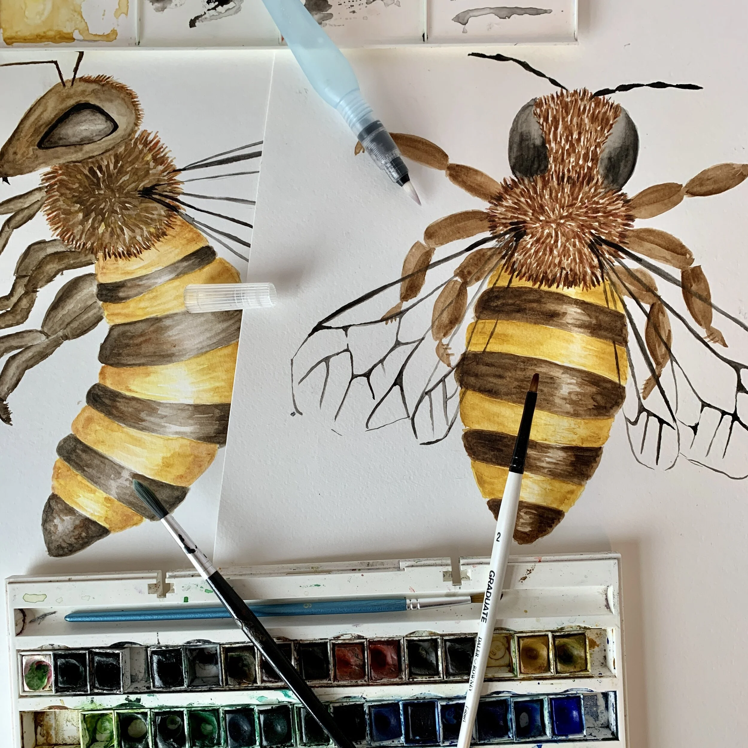 Within the collection I have also included line drawings which illustrate the intricate details of the anatomy of the bees and flora. Focusing on the marks and textures has allowed me to appreciate how small and amazing bees are. I have also carried on my love of collage to make playful bright and bold motifs. This enabled me to use my extensive collection of coloured paper which I enjoy collecting.